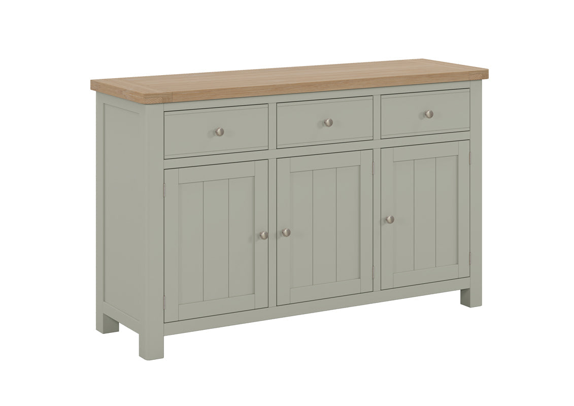 Ce grand buffet entièrement assemblé comprend trois grands placards et trois placards séparés, chacun doté d'une étagère amovible et réglable. Le plateau en chêne clair naturel présente des angles arrondis, mis en valeur par les bords arrondis qui courent le long du bord avant du corps peint. Les tiroirs sont équipés de petits boutons ronds en chrome brossé, et sont également fournis avec des poignées coupelles pour un look différent. (Veuillez noter que ces poignées coupelles ne peuvent être installées qu'une seule fois sur le meuble, car elles sont munies de goujons de positionnement au dos de la plaque de fixation.) Un design compact aux lignes épurées qui s'intègre parfaitement à tous les intérieurs, modernes ou traditionnels.