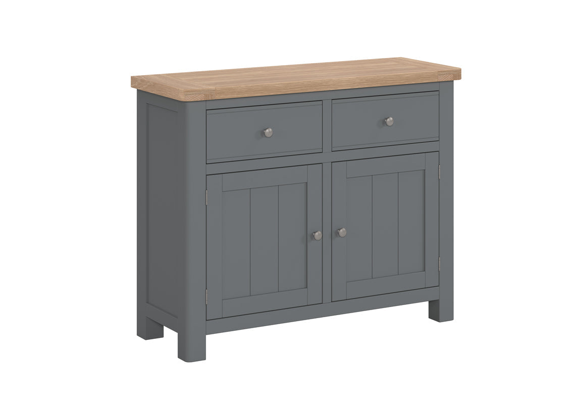 Ce petit buffet entièrement assemblé comprend deux grands tiroirs et deux placards séparés, chacun doté d'une étagère amovible et réglable. Le plateau en chêne clair naturel présente des angles arrondis, complétés par les bords arrondis qui courent le long du bord avant du corps peint. Les tiroirs et les portes sont équipés de petits boutons ronds en chrome brossé et sont également fournis avec des poignées coupelles si vous préférez un style différent (veuillez noter que ces poignées coupelles ne peuvent être installées qu'une seule fois sur le meuble, car elles sont munies de goujons de fixation au dos de la plaque). Grâce à son format compact, ce meuble trouvera sa place dans le salon, la salle à manger ou même dans l'entrée.