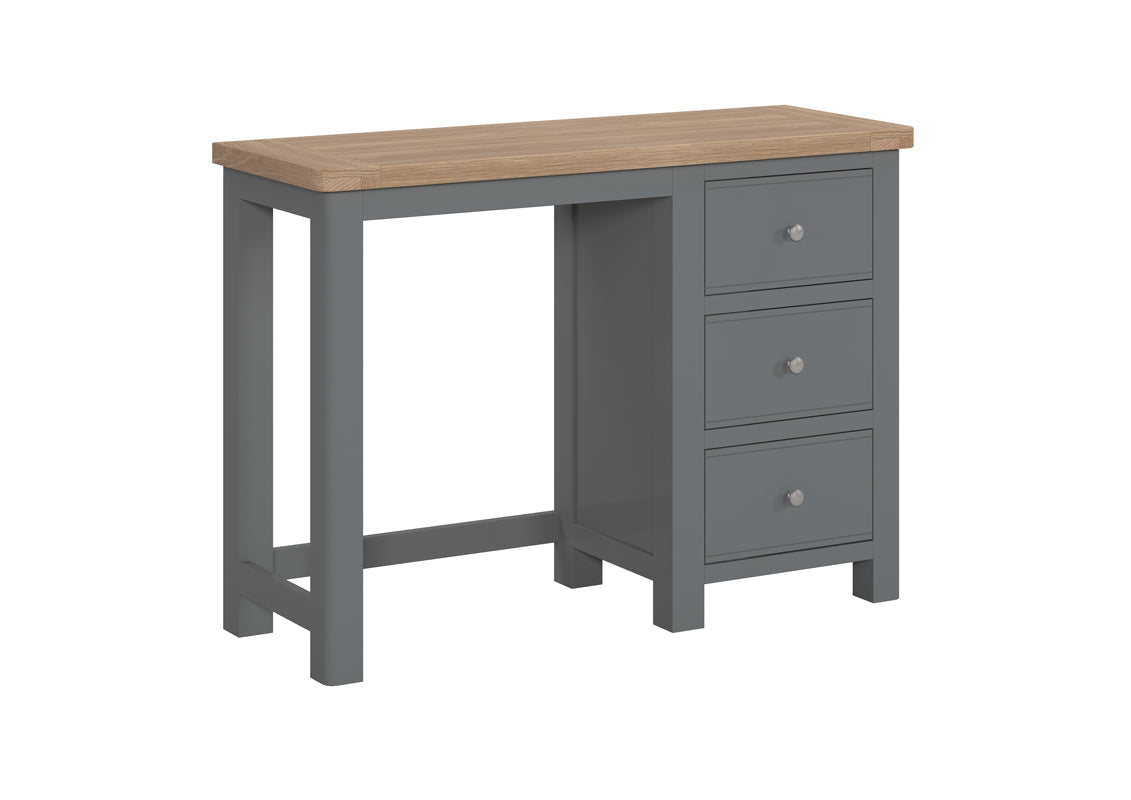Cette coiffeuse entièrement assemblée constitue également un bureau compact idéal pour le télétravail. Elle est dotée de trois tiroirs pratiques et d'une ouverture pour un tabouret (également disponible) ou une chaise. Un miroir sur pied est également disponible. Le plateau en chêne clair naturel présente des angles arrondis, complétés par les bords incurvés qui courent le long du bord avant du corps peint. Elle est équipée de petits boutons ronds en chrome brossé et est également fournie avec des poignées coupelles pour un look original. (Veuillez noter que ces poignées coupelles ne peuvent être installées qu'une seule fois sur le meuble, car elles sont munies de goujons de fixation à l'arrière de la plaque de fixation.)
