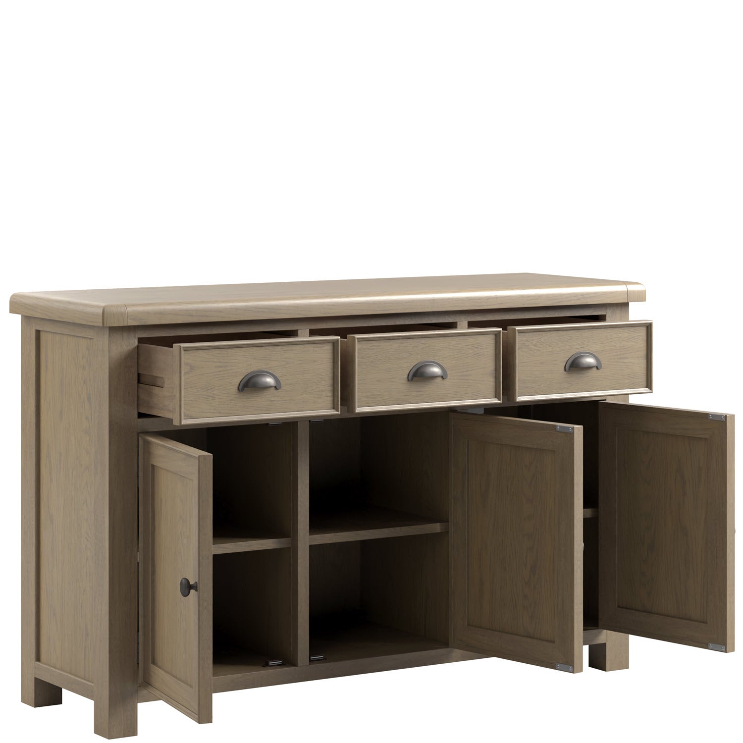 Notre nouvelle gamme « Salisbury » est proposée en finition chêne gris lavé avec un plateau épais aux angles arrondis. Le charme traditionnel d'une ferme s'allie à une touche de modernité. Ce grand buffet est doté de 3 tiroirs avec poignées coupelles et de 3 placards en dessous avec étagères dans tous les compartiments. Les portes sont équipées de boutons ronds. Il embellira tous les intérieurs. Livré entièrement assemblé.