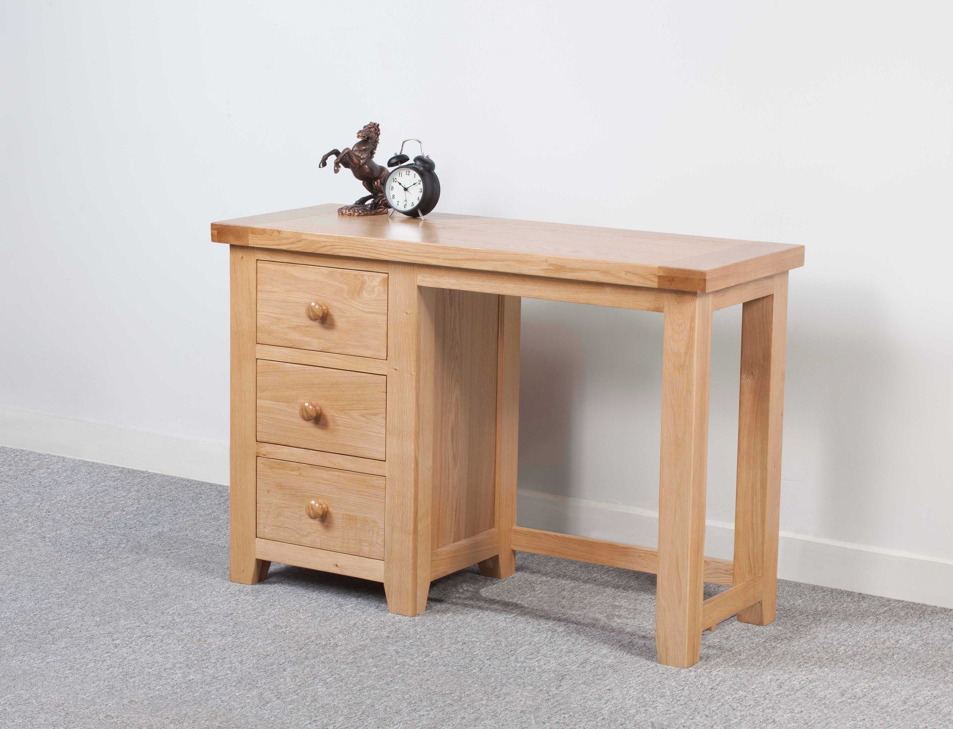 Bureau ou coiffeuse ? À vous de choisir ! Les trois tiroirs sont dotés de poignées traditionnelles en bois ou contemporaines en métal. Leur design imposant aux bords carrés et leur finition chêne clair font de ce meuble un élément incontournable de notre gamme Cotswold, toujours aussi populaire. Commandez dès maintenant pour une livraison rapide.